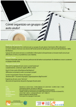 Im November wird die Dienststelle für Selbsthilfegruppen ein Aufbauseminar auf Italienisch mit dem Titel „Wie gestalte ich eine Selbsthilfegruppe?“ anbieten. Das Seminar richtet sich an Betroffene, Angehörige, Ehrenamtliche und Fachkräfte aus dem soziosanitären Bereich, die eine Selbsthilfegruppe gründen bzw. aufbauen möchten. Es werden wichtige Grundlagen für die Organisation, Arbeitsweise und Gestaltung von Selbsthilfegruppen vermittelt. Das Seminar findet 22.11.2023 (am Nachmittag) und am 23.11.2024 (ganztätig) statt - Meldeschluss am 08.11.2024. Für Informationen: 0471 1888110 // selbsthilfe@dsg.bz.it