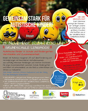 Am 18. November 2024 findet in der Grundschule Lengmoos in Ritten ein Vortrag zum Thema Autismus bei Kindern statt. Fachvorträge sollen die Schwierigkeiten erläutern, mit denen Kinder mit Störungen aus dem autistischen Spektrum im Alltag konfrontiert sind. Es soll auf die Bedeutung der Zusammenarbeit von Eltern, Kindergarten und Schule eingegangen werden. Eltern und Kontaktpersonen betroffener Kinder ebenso wie Kindergartenpersonal und Lehrpersonal sind eingeladen, kostenlos an der Veranstaltung teilzunehmen. Informationen und Anmeldung schriftlich per WhatsApp unter 334/2702300 oder per e-Mail an autismusritten@gmail.com.
